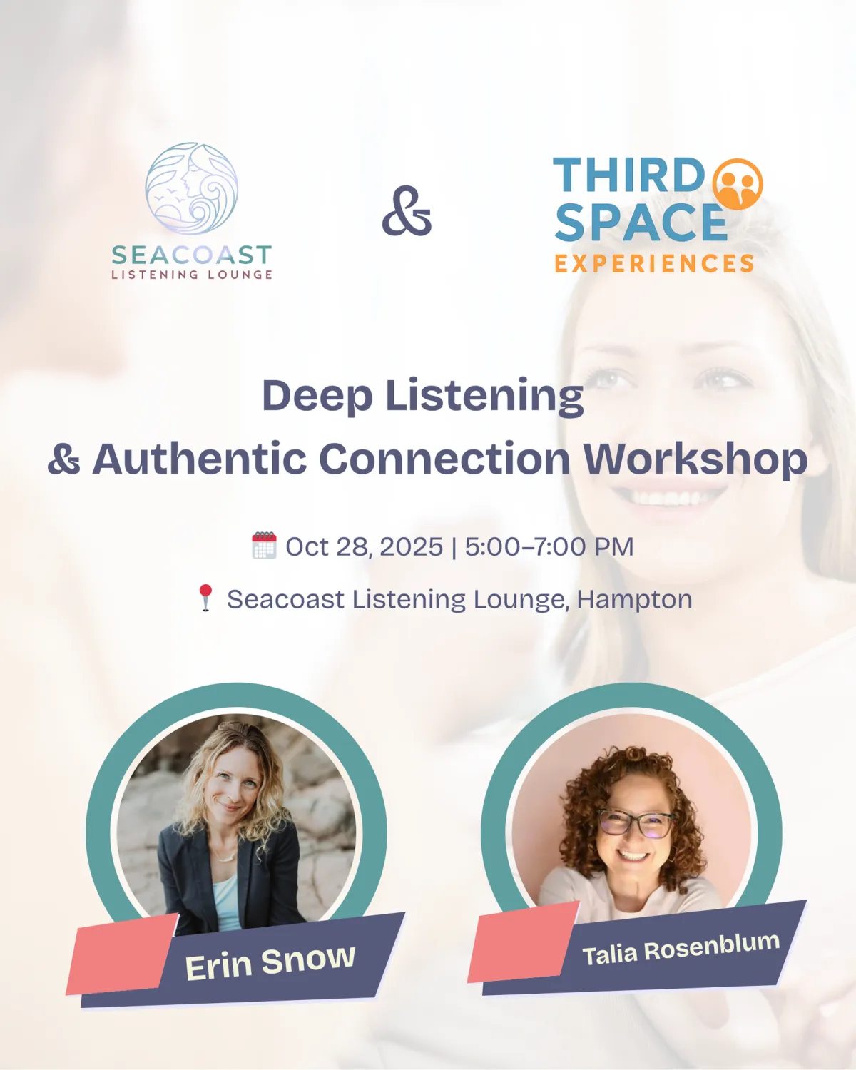 Erin Snow, founder of Seacoast Listening Lounge, is dedicated to helping individuals and communities discover the power of intentional listening as a tool for healing, resilience, and connection. She is joined by Talia Rosenblum, founder of Third Space Experiences, who specializes in creating structured, meaningful conversations that foster authentic human connection. Together, they bring a unique blend of guidance, compassion, and facilitation expertise to help participants experience transformation through the art of listening and authentic sharing.